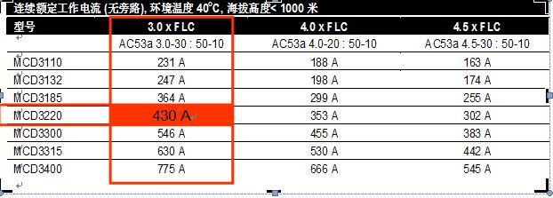當(dāng)起動電流倍數(shù)為3倍時,額定電機滿載電流430A,由此推算其額定輸出電流能力為: