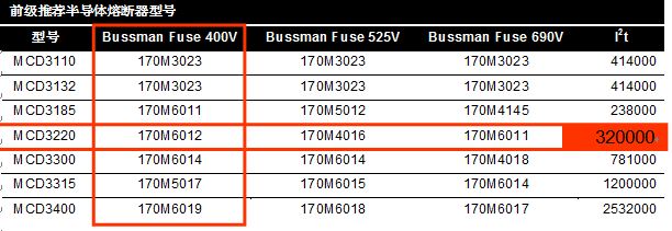 丹佛斯說明書中要求MCD3220前級安裝BUSSMANN的170M6012半導(dǎo)體熔斷器,要求的可控硅需要的短路保護(hù)I