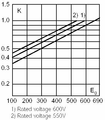 2t值為660V電網(wǎng)電壓時的數(shù)據(jù),所以還要查表求出400V電網(wǎng)電壓時的修正系數(shù),從下圖可以查到修正系數(shù)約為0.61。