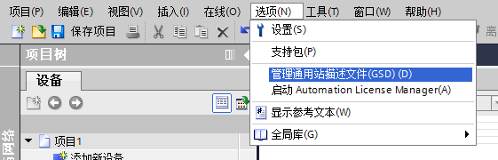 六、如果沒有安裝過 MCA102 的 GSD 文件,則需點擊‘選項’-‘安裝設(shè)備描述文件’, 操作如圖六所示。若已安裝則直接進入第七步。