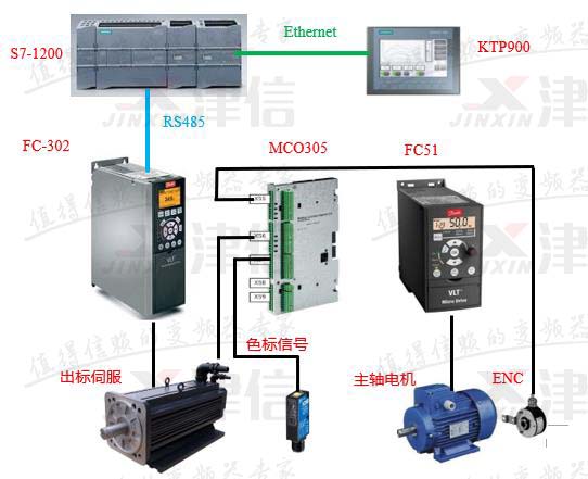 PLC與觸摸屏之間進(jìn)行Ethernet通訊,PLC與丹佛斯FC302變頻器之間進(jìn)行RS485通信,通過觸摸屏可以設(shè)置標(biāo)長、對標(biāo)位置、出標(biāo)起始位置等工藝參數(shù);FC302變頻器控制出標(biāo)伺服電機(jī),以保證出標(biāo)精度及響應(yīng)精度。