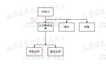 開機(jī)后,首先進(jìn)行程序的初始化。初始化完成后同時(shí)調(diào)用工作模式選擇、報(bào)警和PLC與變頻器之間的通訊程序。工作模式中,包含手動出標(biāo)、自動出標(biāo)兩種狀態(tài)。報(bào)警程序用于對機(jī)器狀態(tài)進(jìn)行實(shí)時(shí)監(jiān)控,并根據(jù)故障情況執(zhí)行相關(guān)動作。