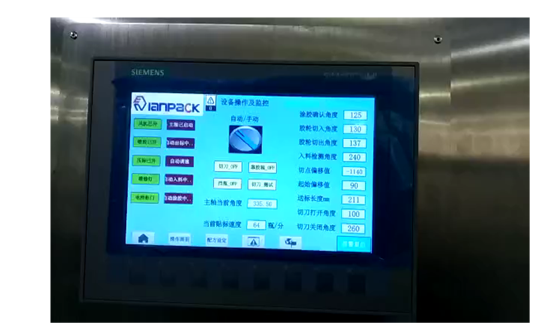 如圖中所示;設(shè)備采用了真空旋轉(zhuǎn)式標(biāo)盤,具有吸標(biāo)、傳輸、貼標(biāo)等多方面功能,同時(shí)涂膠輥與切刀輥負(fù)責(zé)標(biāo)簽的切斷與涂膠,并設(shè)有‘無瓶不出標(biāo)’和‘無標(biāo)不涂膠’功能,提高了貼標(biāo)效率與工作的可靠性。