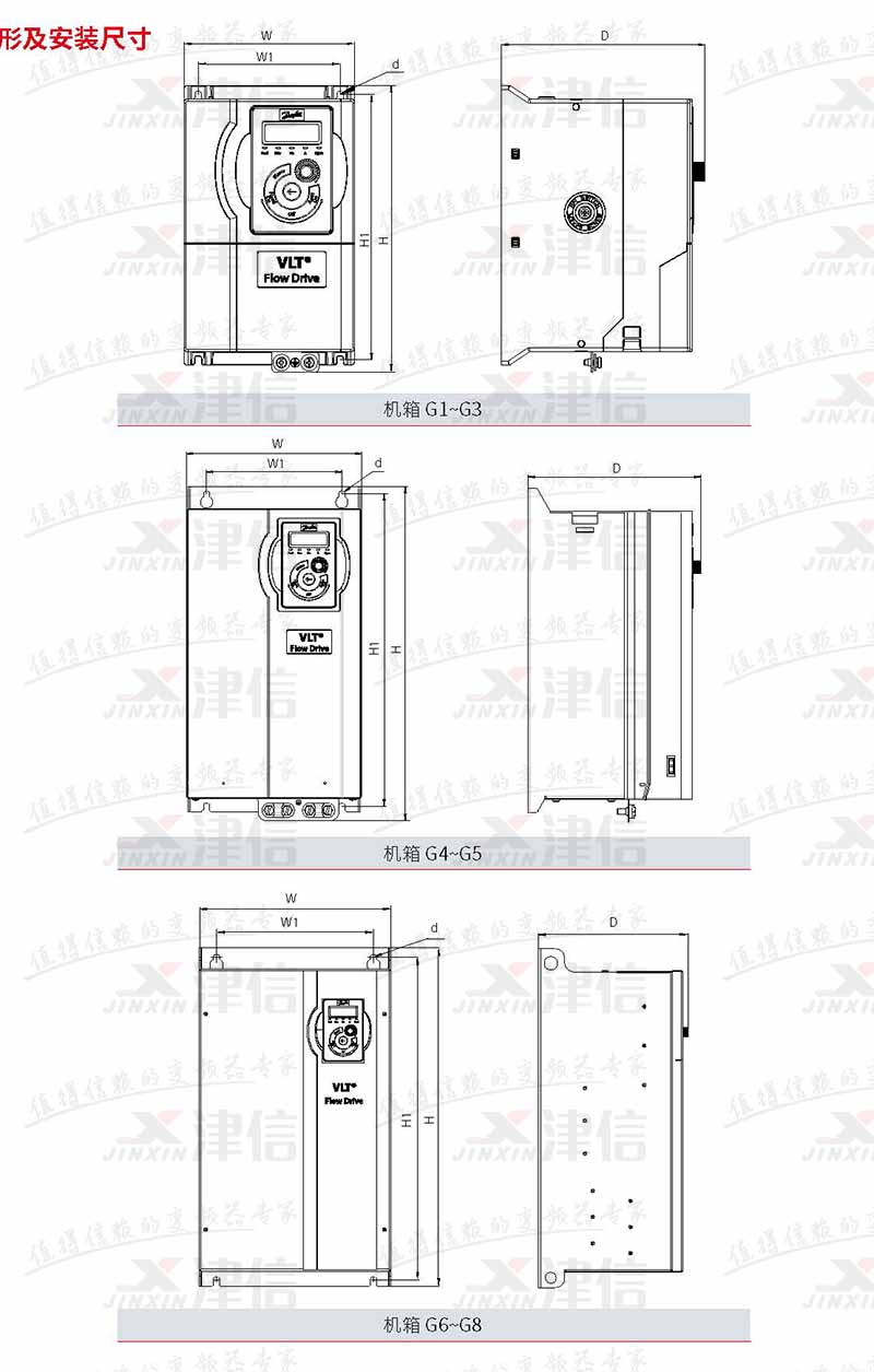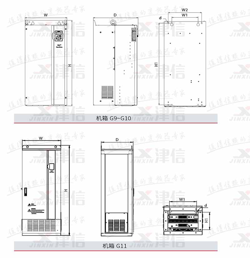 | 機(jī)箱型號(hào) | 適配的功率范圍 (kW) | 外形尺寸 (mm) | ||||||
