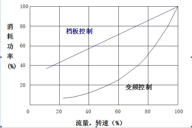 交流驅(qū)動(dòng)系統(tǒng)實(shí)際使用時(shí),可通過實(shí)測(cè)或根據(jù)其靜態(tài)特性的理論計(jì)算,作出其轉(zhuǎn)速對(duì)功率的特性曲線,由于轉(zhuǎn)速與流量成正比,該曲線即流量對(duì)功率的特性,如圖1所示。與檔板調(diào)節(jié)相比較,可見其節(jié)能是顯著的。