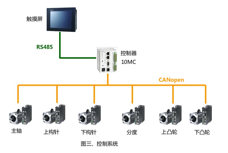 10MC運(yùn)動(dòng)控制器的COM2口與DVP-B10S411觸摸屏通過(guò)RS485通訊,通過(guò)觸摸屏可以設(shè)置用戶工藝參數(shù);控制器的CAN端口與A2伺服進(jìn)行CANopen通訊,通過(guò)CAN總線控制伺服的運(yùn)動(dòng)、讀取伺服的狀態(tài)。
