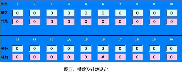用戶可以通過(guò)HMI一鍵生成“逐槽綁”數(shù)據(jù),也可以自行設(shè)定綁扎槽位順序,自定義每一槽針數(shù),還可以設(shè)定定子分度方向,從而實(shí)現(xiàn)逐槽綁、花式綁、正綁、反綁。設(shè)定界面如圖五所示。