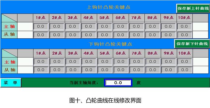 10MC總線運(yùn)動(dòng)控制器控制主軸運(yùn)行,主軸帶動(dòng)機(jī)械凸輪控制鉤針的前后運(yùn)動(dòng),同時(shí)主軸又作為鉤針、上下電子凸輪的主軸信號(hào),控制鉤針?biāo)欧⑸舷峦馆喫欧鶕?jù)預(yù)設(shè)的凸輪數(shù)據(jù)運(yùn)動(dòng)。