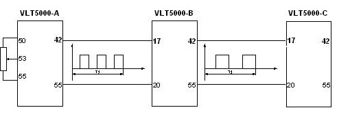 系統(tǒng)由5臺(tái)VLT5000系列變頻器及輔助的開關(guān)、指示燈、電位器及必要的空開等電氣器件組成。圖-1中A變頻器的速度作為主速給定(它自身的速度由外部電位器給定), A變頻器的42號(hào)端子對應(yīng)自身輸出轉(zhuǎn)速,自動(dòng)的轉(zhuǎn)化為脈沖信號(hào)(頻率)輸出給B變頻器,作為B變頻器的速度給定信號(hào)(通過B變頻器的29號(hào)端子來接收脈沖信號(hào)),然后再由B變頻器通過修改內(nèi)部參數(shù)327號(hào),經(jīng)過計(jì)算后相應(yīng)的輸出一定的轉(zhuǎn)速。同理B變頻器對應(yīng)自身輸出轉(zhuǎn)速自動(dòng)的轉(zhuǎn)化為脈沖信號(hào)(頻率)通過42號(hào)端子輸出脈沖信號(hào)(頻率)作為C變頻器的速度給定信號(hào)(通過C變頻器的29號(hào)端子來接收脈沖信號(hào)),以此類推,一直到E變頻器。在此過程中,所有速度給定信號(hào)都是數(shù)字式的(既速度信號(hào)通過給定的脈沖頻率的變化,結(jié)合自身內(nèi)部的計(jì)算實(shí)現(xiàn)不同的轉(zhuǎn)速)。