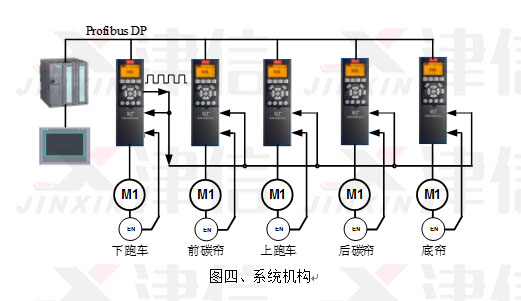 驅(qū)動系統(tǒng)的整體結(jié)構(gòu)如圖四,每根軸獨立按自己的電子凸輪曲線運行,屬于典型的分布式控制系統(tǒng),對主控制器的性能要求,一般的PLC就能勝任。由于每根軸都與主軸保持電子凸輪同步關(guān)系,所以總體上可以實現(xiàn)多軸同步的控制需求。其中下跑車運動控制器比較特殊,他具有虛擬主軸脈沖輸出的功能,代替主控制器發(fā)送主軸脈沖信號。