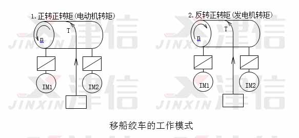 移船絞車(chē)是重要的海工設(shè)備,在海上工作平臺(tái)、鋪管船里有廣泛的應(yīng)用。移船絞車(chē)的工況與起升相似,正轉(zhuǎn)時(shí)收線,變頻器工作于電動(dòng)機(jī)模式,電機(jī)對(duì)負(fù)載作功;反轉(zhuǎn)時(shí)放線,變頻器工作于發(fā)電機(jī)機(jī)模式,負(fù)載對(duì)電機(jī)做功,要求變頻器內(nèi)置制動(dòng)晶體管。與普通起升不同的是,移船絞車(chē)連續(xù)工作時(shí)間很長(zhǎng)(數(shù)小時(shí)),所以對(duì)于變頻器的過(guò)載能力要求不高,但是要求變頻器具有100%制動(dòng)轉(zhuǎn)矩連續(xù)運(yùn)行的能力。