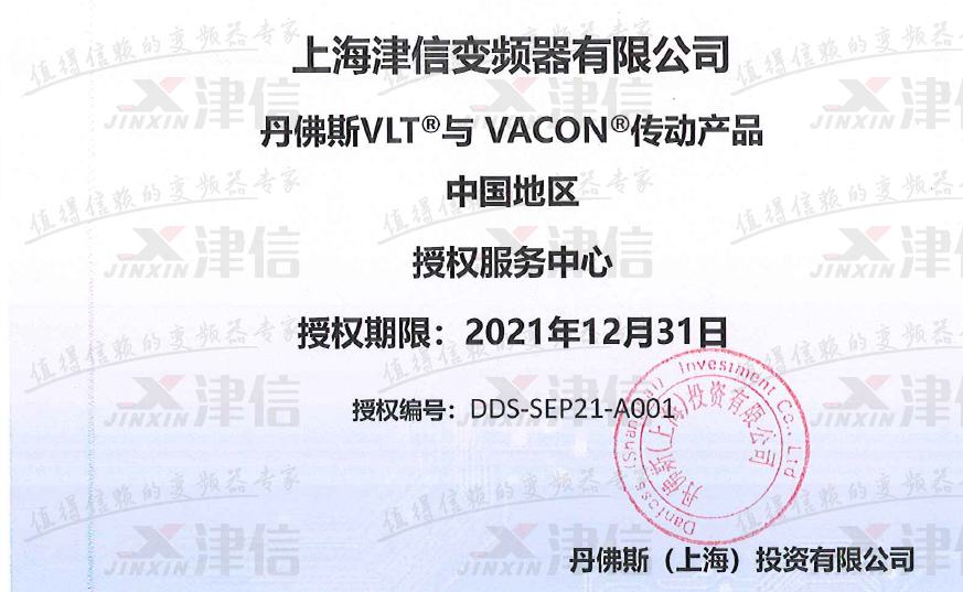 2021年上海津信丹佛斯和偉肯變頻器服務中心授權(quán)證書